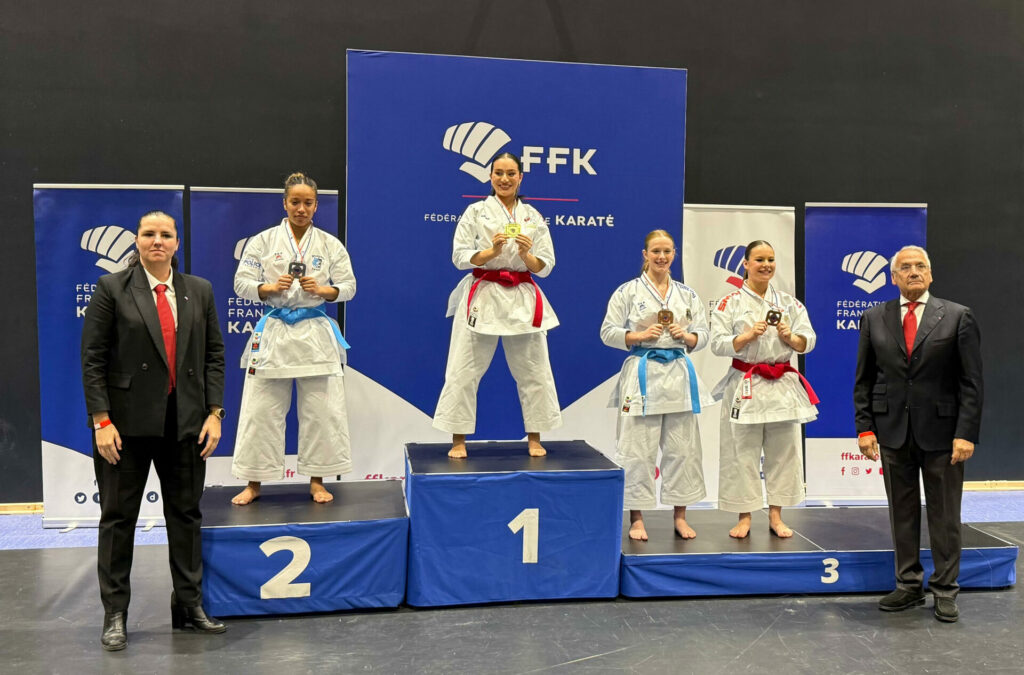 En photo, Maï-linh BUI remporte la compétition en Kata face à la tenante du titre et Ninon VAUCELLE s’octroie une très belle 3ème place.